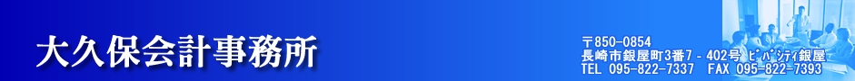 大久保会計事務所 〒850−0854 長崎市銀屋町3番7‐402号 ビバシティ銀屋 TEL 095−822−7337 FAX 095−822−7393 |